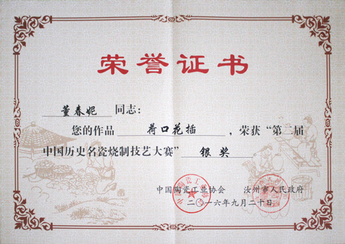 2017-董春妮-荷口花插-榮獲第二屆中國歷史名瓷燒制技藝大賽銀獎(jiǎng)