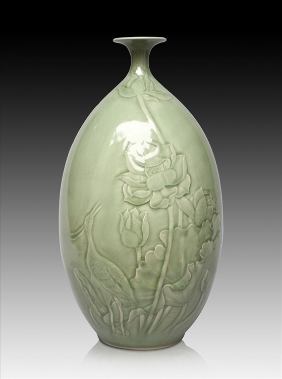 此作品采用耀州窯傳統(tǒng)釉色,色質(zhì)清雅,溫潤(rùn)如玉,大腹,瓶頸處收緊,瓶口又微微擴(kuò)張,瓶身刻繪傳神雅致,呈現(xiàn)出一幅夏日荷塘的清幽靜謐之景。是饋贈(zèng)和陳設(shè)之佳品。