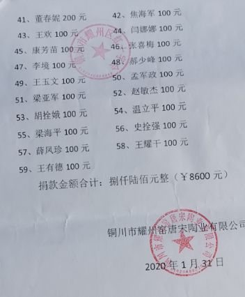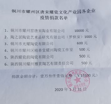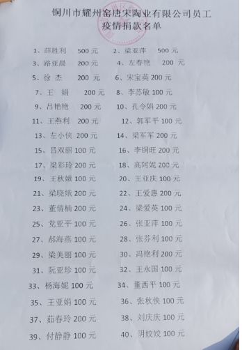 你一百,他二百,她五百……園區(qū)和公司的工作群剛剛發(fā)出倡議,財務人員馬上就收到了到賬提醒。經(jīng)過統(tǒng)計,耀州區(qū)唐宋耀瓷文化產(chǎn)業(yè)園區(qū)6個企業(yè)捐款13100元,唐宋陶業(yè)有限公司59名員工捐款8600元。
