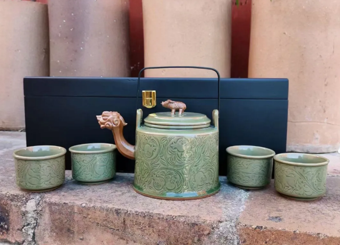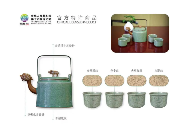 耀州窯龍首長安印茶具套裝,分為一壺四杯,壺嘴龍首設(shè)計,壺蓋頂牛尊設(shè)計,均利用出土文物原型為創(chuàng)作藍本,耀州窯青釉雕刻。四杯均以秦嶺四寶為原型延展創(chuàng)意設(shè)計,由十四運組委會官方許可全國發(fā)行,集實用之美,收藏之美,欣賞之美于一體。