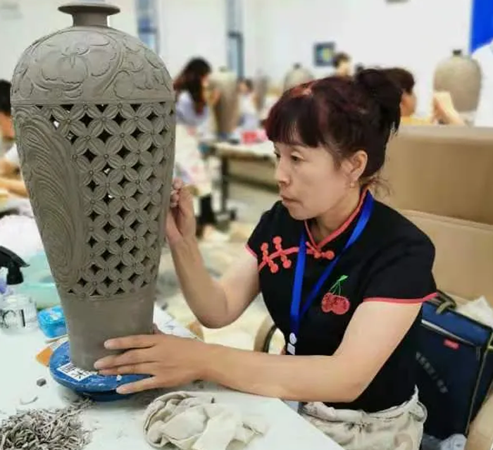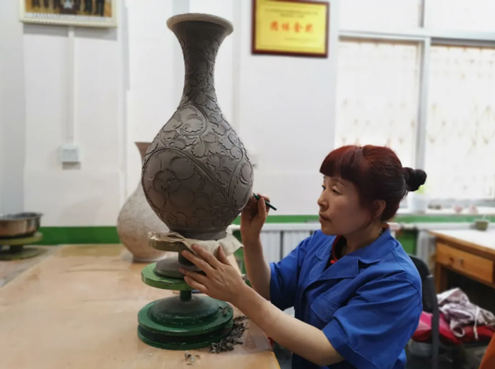 2005年,在耀州區(qū)殘聯(lián)的介紹下,左小俠進(jìn)入唐宋陶業(yè)開始學(xué)習(xí)刻花。沒有任何美術(shù)功底的她,每天工作完回到家,就在網(wǎng)上尋找刻花圖案,獨(dú)自練習(xí),提升自身技能。左小俠總是積極參加公司組織的各種專業(yè)培訓(xùn)和技能大賽,鉆研耀州窯的理論知識和經(jīng)典作品的造型和裝飾,多次到耀州窯博物館參觀學(xué)習(xí),努力提高自己作品的藝術(shù)水準(zhǔn)。